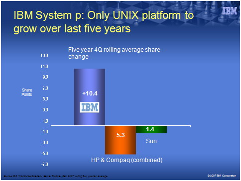 industry, while consuming roughly the same amount of power. And that will the "green" Power6 it do for IBM's business? Well, it will probably extend the market share gains the company has already notched up in the last five years (see the right thumbnail). As you can see from the right chart, IBM share is up by over 10 points, while HP's and Sun's is down. And that's even before Big Blue's first green chip hit the street.