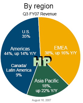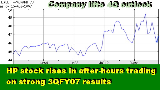 Updated 8/16/07, 10:20PM PDTAnalysis of Hewlett-Packard's Third Quarter ResultsProfitable Growth Continues HP Revenues, Earnings Again Beat Expectations; Company Lifts 4Q OutlookSCOTTSDALE, Aug 16 - HP did it again. Ever since Mark Hurd took over HP's helm in April 2005, he has been raising the bar of expectations one quarter only to exceed it the next. And he did it again in the company's third fiscal period. Excluding one-time charges, the company earned 71 cents per share, five cents higher than the average Street estimate. Revenues jumped by 16% to $25.4 billion, more than 5% or over $1 billion higher than what analysts had expected. The "hero of the quarter" was again HP's PC line of