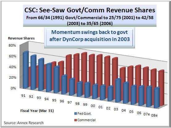 or $1.42 per share, from For the full year, revenues were $14.9 billion, up 1.5% (down less than 0.5% in constant currency) over last year’s comparable 12-month period. This makes CSC the sixth largest IT services company in the world [not fifth (!), as the U.S.-focused media tend to report - see the right thumbnail for actual global rankings]. Business Segment Analysis U.S. government sector revenues increased 5% to $1.43 billion in the fourth quarter, up from $1.37 billion in fiscal 2006. The Pentagon-related business was $978 million, up over 6% from the year-ago total, while revenues from civil agencies were $415.1 million, down slightly compared to last year. Fourth quarter global commercial revenue was $2.61