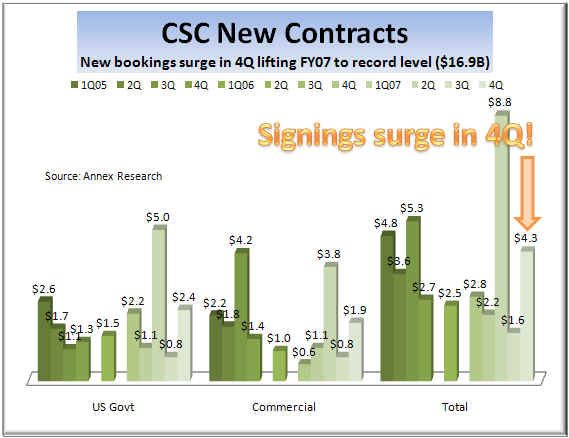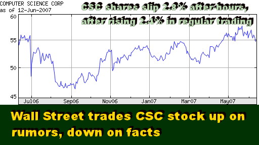 For the full fiscal year 2007, that ended March 31, "special items" amounted to $316 million or $1.56 per share. That's not a small piece of change given that the company's net income was $389 million, down from $471 million the year before. In the latest (fourth) quarter, the charges against earnings were $36 million or 14 cents per share. Stock Slips Despite Good Quarterly Results Wall Street generally likes charges, so it traded CSC shares up 2.4% to $56 in regular on rumors about a good quarter and write-offs. But then investors turned around and sold the stock off, down 2.8% to $54.5 in after-hours trading, after the fourth quarter facts were disclosed. So our old adage "up on rumors, down on facts" once again came true. Nevertheless, CSC shares are now still at about the same level as a year ago, when the company tried and failed to sell itself off, and then resorted to stock buybacks as its "plan B" strategy (see above chart). Revenue Shortfall Sinks Shares And what was so disappointing about the fourth quarter facts? Actually, not much. We thought it was a pretty good quarter. Revenue was a little light relative to Wall Street expectations, but new contract sales by far exceeded them, thus implying solid revenues and profits in the future. While revenue rose to $4.05 billion from $3.89 billion, it missed slightly Wall Street's average estimate of $4.1 billion.