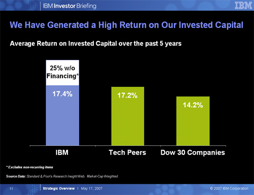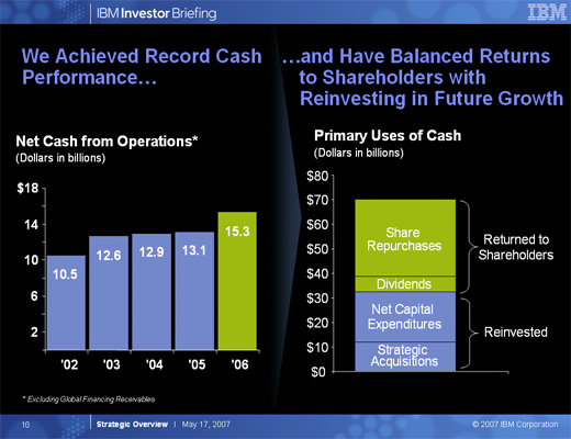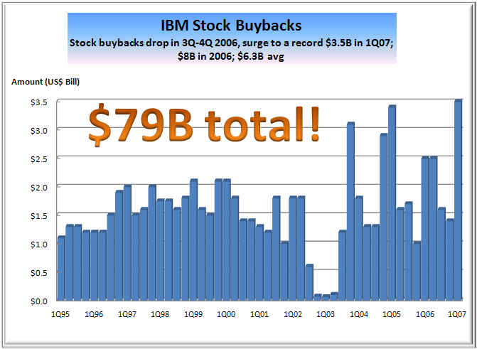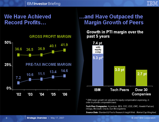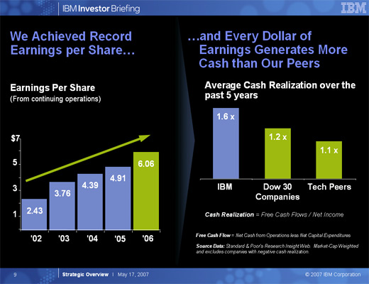 Besides being fast-growing markets, the BRIC's are also "hubs for global innovation, and hubs for global delivery," Kern pointed out. Together, they accounted for $4.5 billion of IBM revenues last year, up 21% from 2005. The BRIC countries also represent 43% of worldwide population and just under 10% of global GDP. But by 2035, they will account for over 25% of the worldwide GDP, Kern predicted. So "BRIC by BRIC my fellow Netizens, BRIC by BRIC," seems to be the modern Big Blue version of Roman Emperor Hadrian's famous epigram. The road to top line growth leads through Brazil, Russia, India and China. "Rome Was Not Built in One Day" But "Rome was not built in one day," as John Heywood, a British playwright, noted in 1546. IBM's Palmisano also seem to plead for patience when it comes to Big Blue's global positioning and strategy. "This is just the beginning. We have a lot of work ahead of us," said Palmisano, sounding like HP CEO. Mark Hurd said last night, "HP is still transforming... we're not even close to being done" (see "Per Ardua Ad Astra," May 2007). "I know, everybody likes to obsess on revenues," Palmisano also said, echoing his Partnerworld speech. But he said IBM is a much more profitable company today than it was a few years ago. "We have a lower center of gravity in our operations... and a business model that generates better earnings, profits and cash from every dollar of revenue," he said. "We’ve got better margins, more profitability and better cash flows." The IBM CEO then proceeded to prove that assertion with a set of charts that compared IBM to its "Tech Peers" (Accenture, BEA, CSC, EDS, EMC, HP, Infosys, Microsoft, Oracle, Sun), and the "Dow 30 Companies." Cash flow here is “fully loaded,” with pension plan funding taken into account, the IBM CEO said, referring to the right chart above. "We continue to use cash prudently," he added. " And we continue to invest in businesses that generate cash." Well, that is only partially true... As we heard last month, IBM announced its intention to buy a record $15 billion of its own shares, on top of nearly $80 billion the company had already acquired so far (see "To Buy (back shares) or Not to Buy? ," Apr 2006 and the left chart above). Since that time, IBM has been repurchasing about $100 million of its shares every day, said Mark Loughridge, IBM CFO (see middle chart). That's a lot of money going into Wall Street's pockets instead of into IBM's business. Furthermore, the company is greasing their palms by borrowing money to buy back shares. With share repurchases as the only blemish in an otherwise sound IBM growth strategy, Palmisano summed up his industry comparisons as follows: "By any comparison, this (IBM) financial model has outperformed the Dow 30 and our tech peers." Outlook: Macro Trends Favor IBM As he did in St. Louis on May 1, IBM's CEO also