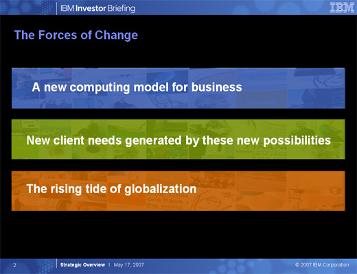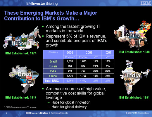 Updated 5/18/07, 2:00PM PDT, updates Market Update...Echoes from IBM's Annual Conference for Financial AnalystsBRIC by BRIC... to Top Line Growth IBM Sees Emerging Markets as "Engine of Growth"