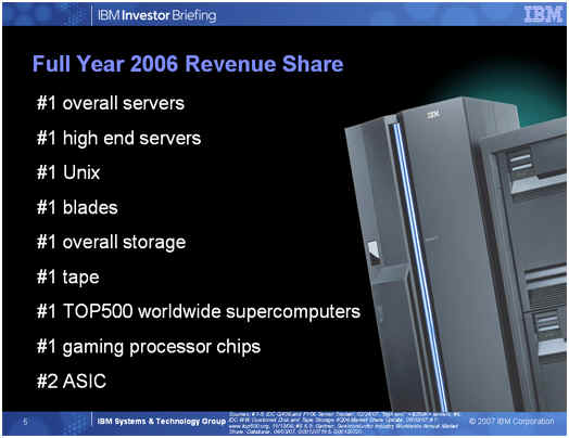 Zeitler, IBM's hardware Zeitler's remarks also echoed some comments he and others made at last week's IBM press conference in New York City (see "The Greening of Big Blue," May 2007). It is that kind of customer demand that has propelled IBM into the leading market share position in many of its hardware offerings (see the left thumbnail). Market Shrugs Off IBM, HP, Embraces Sun, Apple Despite the bullish IBM comments and HP's excellent latest quarterly results, however, the stock market shrugged off the two IT leaders today's good news stories, while embracing Sun and Apple. As of "high noon" today, both IBM and HP