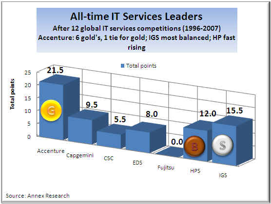 Just to recap quickly for our new readers the IT Services Octathlon scoring… The overall medal standings are determined by awarding three points for a “gold,” two points for a “silver,” and one point for a “bronze” in each of the eight competitions of the top global IT services vendors.