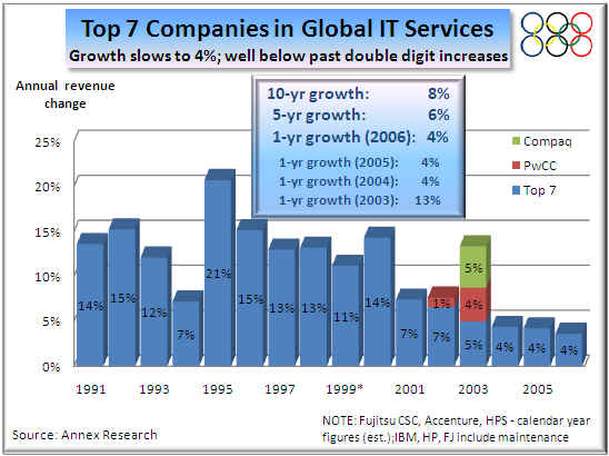 The currency- and acquisitions-aided growth of our two gold medal winners this year barely masks a chronic problem that has enveloped the top 7 players in the global IT services game.  It is a lack of growth.  For the last three years, it has averaged only 4%.  Which is four to five times less than their average growth rates of in the 1990s (see above chart and the thumbnail below).
