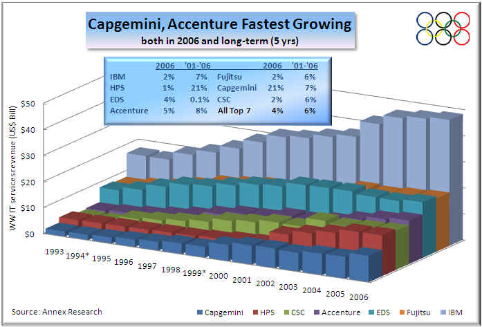 NOTE: Growth by acquisitions applies to all revenue medal winners except for Accenture.  As we first noted in 2003, Accenture is the only company among the Top 7 whose growth has been mostly organic (internal).  The only exception was its 2006 acquisition of Capgemini's North American healthcare operation.  But the purchase of a $170 million revenue-unit (based on its 2004 results) was a relatively minor move on Accenture scale of things that did not have a material impact on the company's growth rates.