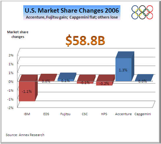 In the U.S. market, Accenture gained share in 2006, mostly at IBM's expense.  The rest of the competition more or less treaded water (right chart)