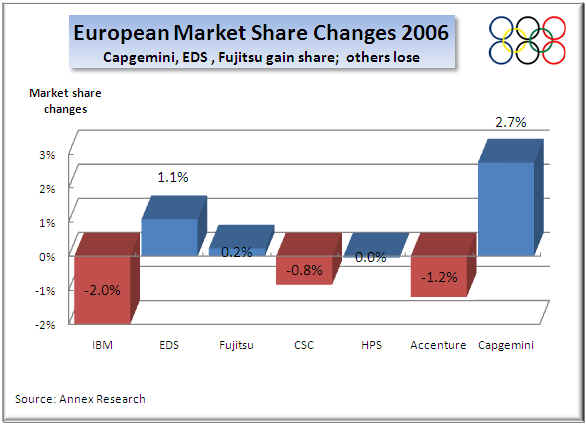 Capgemini, EDS and Accenture were the market share gainers among the Top 7 in a year that did not see much movement in this Octathlon category.  None of the competitors won or lost more than a point of market share in 2006.