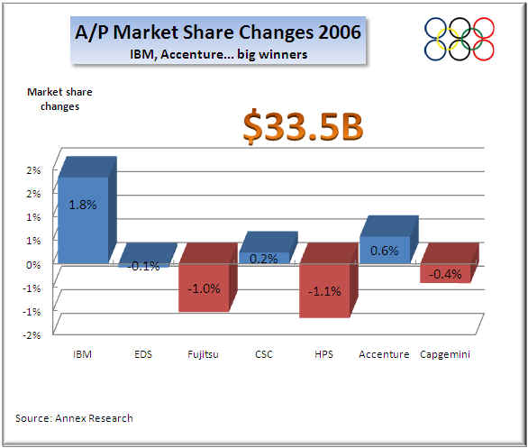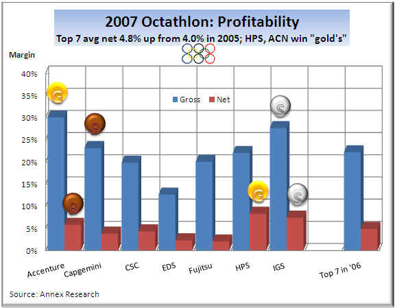 The net margin “gold” went to HPS this year for its vastly improved profitability in 2006.  IGS and Accenture claimed the “silver” and the “bronze” respectively.