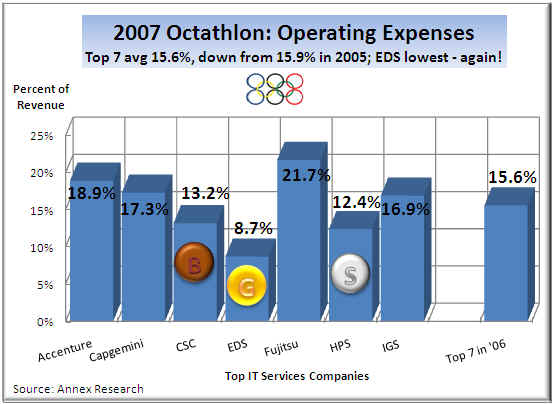 The “silver” medal winner HPS came in at 12.4% of revenues, while the third place finisher CSC clocked in at 13.2%.  The top 7's operating expenses averaged averaged 15.6% in 2006.