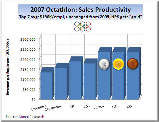 HPS edged out Fujitsu and IBM by a nose in 2006  to win the “gold” in the sales productivity category (revenue per capita).  The “silver” and the “bronze" medal winners were virtually in a dead heat.  It was the same lineup of medal winners as in last year's Octathlon.  The aggregate average sales productivity of the Top 7 competitors was flat with 2005 at about $196,000 per capita.