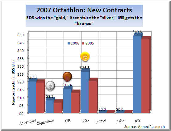 EDS won the "gold" in new contract sales in 2005 with a 38% improvement (to $20.5 billion) over the dismal 2004 results.   And in repeated that feat last year with a 29% surge to $26.5 billion despite, what Wall Street calls, a "difficult comparison."   Capgemini got the "silver" with a 21% jump, while CSC earned a "bronze" with an 18% increase.