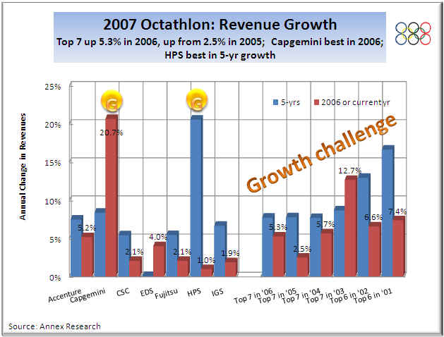 Some IT leaders are looking to supplement indigenous growth with big acquisitions.  Capgemini's and EDS's purchases of Kanbay and MphasiS respectively (see "By Leaps and Bounds," Oct 2006, and "On Sunny Side of Street," Feb 2007), would certainly qualify as "big" ones.  But they happened late in 2006, and thus did not affect the Octathlon 2007 results very much.