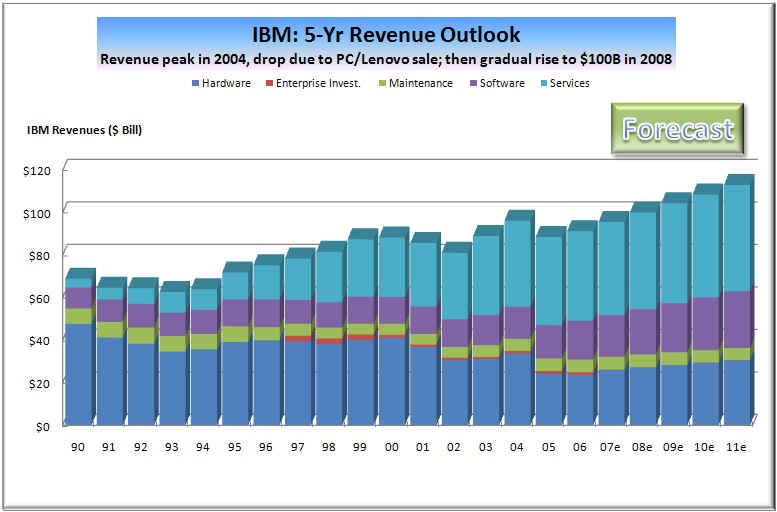 divesting of businesses that are commoditizing, All this fits neatly with the goal the IBM CEO stated on June 7 of last year in Bangalore, India (click on the right chart to read the full quote). Basically, Palmisano echoed the title of our 2005 five-year forecast for IBM - "Quality over Quantity" (Mar 2005), when he said that IBM would exit any commodity-type business (such as PC). But is it enough? We don't think so. As you say in our last week's analysis of IBM Global Services' business results and outlook, the largest IBM business segment's growth has been rather sluggish in the last several years (see "IGS: Growth Slows, Profit Surges," Mar 2007. And one one to reinvigorate the growth, we said, was to split it up along the industry lines into smaller, nimbler and more autonomous units. Forecast Summary Okay, so net it out, without significant