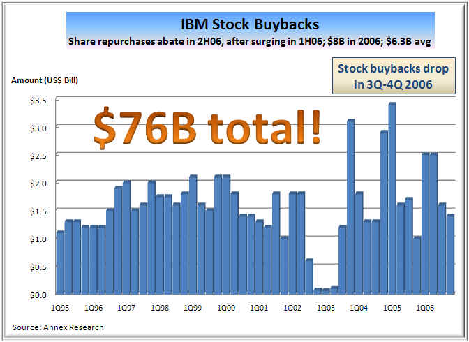 The new employees, first and foremost, it would Three years earlier, IBM had only 9,000 people there, before the company dramatically stepped up its efforts to lower costs by doing more software development, services work and customer support from India. That makes India the second-largest country for IBM, trailing only the United States, where IBM's work force rose slightly to 127,000. IBM reported that at the end of 2006 it employed 355,766 people worldwide, up from 329,373 one year earlier. "We’ve had a sharp focus on productivity, to expand margins and drive more efficiency in our business. And we have accelerated our move to a globally-integrated company," Mark Loughridge, IBM CFO, said on Jan 18 as the company unveiled its 2006 year-end results. ""We continue to make investments in sales, delivery and business development skills across our entire set of offerings, as well as invest in strategic outsourcing infrastructure and BTO capabilities." At the present torrid race of hiring, Big Blue may have some 100,000 employees in India by 2010, predicts AMR Research. By the same year, we expect IBM revenues to be $110 billion and its net earnings $12.4 billion. And that's without any more aggressive acquisitions. "Save:" Reduce Stock Buybacks Another aspect of IBM's taking our