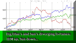 sales of Sun- "It's great to have the fastest microprocessor on earth," he reportedly told the Wall Street Journal (Aug 7). Well, that's a stretch. IBM's new Power6 chip, with a record-setting clock speed of 4.7 gigahertz, really deserves the title of the world's fastest microprocessor (see "IBM's First 'Green' Chip," May 21). So Sun could save itself a lot of trouble and expense if it were to join forces with IBM. Remember the old adage, "if you can't beat them, join them?" Sun says its operating system, Solaris, is good at breaking tasks into threads, as is other Sun software based on its Java programming language. And now that Big Blue can offer it on its hardware platforms, that means it will be also good for IBM from now on. Happy bargain hunting! Bob Djurdjevic