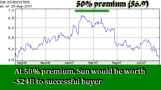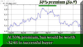 said Bill Zeitler, senior vice And what's in it for Sun? More business; bigger revenues, its CEO believes. "Once we separated our software and hardware businesses we've sold more of both," said Schwartz answering an analyst question. "We've seen the days of tying the hardware and software, and it just doesn't work (anymore)," he added. According to David Boyes, the head of Sine Nomine, a company that helped IBM port Linux to the System z, the Solaris move would help reassure (Sun's) StorageTek customers of continued mainframe commitment by Sun, and shore-up Sun's lost ground in the last four years with Solaris deployments in large enterprises (click here for Boyes' presentation on this). More Than Meets the Eye? Should IBM Acquire Sun? And what about the Unix competition? There has been no mention of Solaris on System p or Unix in the release. Would today's deal not diminish the opportunity for Sun new server sales? Possibly. So why would Sun do it? We don't know for sure. Maybe the Polaris revenue boost is enough? Or maybe there is more to come? Like porting Solaris to the System p. We think that would make sense for both companies. "That's certainly something I would like to see happen," said IBM's Zeitler, answering a question during the press conference. Sun's Schwartz did not disagree. "The relationship we have with IBM is really the strongest we have with any (IT) player in the marketplace," he said. He added that he and Bill (Zeitler) both hoped that it would open doors to "maximum market opportunities." And that may include a Unix deal, too. A soup-to-nuts IBM-Sun partnership could end up being a better deal for both - whether IBM acquires Sun, or enters into some sort of a joint venture deal that would eliminate the Unix competition between the two hardware platforms. Sun would then be able to save a ton of development money that's been going into the hardware competition with IBM. And IBM would gain huge influence on the industry, especially at the low end, where it is weak. And if IBM were to buy Sun, how much would such an acquisition cost? Probably about $24 billion, assuming a (hefty) 50% premium over the current market cap at just over $16 billion. The $6.9 share price (50% premium) would actually be only slightly above the 52-week high that Sun's shares reached in January (see above charts). So it's not like the would-be buyer would be grossly overpaying for the company. By the way, we first talked about Sun as a potential takeover target over four years ago (see “Let the M&A Games Begin,” Annex Bulletin 2003-20, June 2003). Its price back then was just a tad higher than it is today. Given IBM's improving and Sun's declining market fortunes, such a deal would probably boost both stocks. All IBM would need to do is stop throwing tens of billions of dollars in stock buybacks for a while, and voila... Big Blue would own a software company "par excellence." A software company? Yes. Sure, Sun has servers and designs chips; good chips at that (see below). But somebody else always manufactures them (Fujitsu, Texas Instruments in the past). So why not IBM? Furthermore, we have been saying for years that Sun's real "crown jewel" is its software, not its hardware: