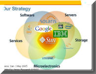 That was nine years ago. And just yesterday, in a clear challenge to Microsoft's popular Office software, Sun announced that Google has begun distributing its StarOffice suite of word processing, spreadsheet and other workplace-oriented programs for free, as part of the Google Pack download. Sun Googling for Microsoft By adding Sun's software, Google is giving a valuable endorsement to a server and software maker that has struggled to return to sustained profitability ever since. Just how ubiquitous Sun's software already is can be seen from the fact that its OpenOffice suite has been downloaded about 100 million times. In reciprocal move, Sun has also added Google search capabilities to all of its StarOffice products. That will allow users to run online Google searches right out of their word processing documents. "It's a paradigm shift," Sun's executive vice president in charge of software, Rich Green, told the AP in an Aug 15 interview. "It brings together office productivity, networking and search into one offering." The initial partnership between the Silicon Valley neighbors (Sun and Google) was originally announced in October 2005. Still Chipping at Hardware Despite its obvious software prowess, and unimpressive hardware results, Sun continued to chip at its processor business. Only last week (Aug 7), the company announced a chip that is very good at executing multiple "threads," sequences of programming instructions carried out simultaneously. Sun's new chip, formally called UltraSparc T2 (also known by the code name Niagara 2), can execute as many as 64 at once. Sun's CEO Schwartz predicted Niagara 2 will jump-start