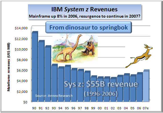 So what zAAP really stands for is a Big Blue marketing coup. For, these "specialty engines" are a form of deep discounting that allowed IBM to drop the price for the largest and best of its customers with a strong appetite for 'CPU-hungry' Java workloads, while maintaining the high water mark pricing for its general purpose mainframes. "zAAP's are so cheap that it is cost-effective to run them even at lower utilization rates," said Gladstone. Add to it the virtualization trend, and the result was a huge increase in workloads and demand for mainframes. So our 2005 "Poughkeepsie Spring" seems to be yielding abundant harvests for Big Blue in 2007. Which makes mainframes sort of like pineapples... on a two-year gestation cycle. :-) That's why Hawaiian farmers plant multiple fields each year so they have continuous pineapple harvests (kind of like what "virtualization" does to server farms). What IBM has now figured out is how to apply an agricultural practice to high tech and grow z pineapples in Poughkeepsie.