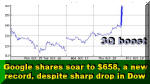 Not surprisingly, Google shares soared by another six points immediately after the earnings release to a new high of $645, after rising 1% in regular trading to close at $640. Google Shares Soar to $658 Despite Sharp Drop in Dow SCOTTSDALE, Oct 19 - Undaunted by broader market declines that marred most major IT stocks, and sent the Dow Industrials down in triple digits, Google shares soared after the opening bell this morning to $658, a new record high. But Google was not the only major IT stock to defy market gravity. Apple shares went even higher, also setting new records. Guess all that money that's fleeing the financial sector, the big IT stocks and the housing market, has to land somewhere. And what better place to do it that on two companies that have been the driving and defining force of the current decade - the "GooglePod" era, as we dubbed it in May.