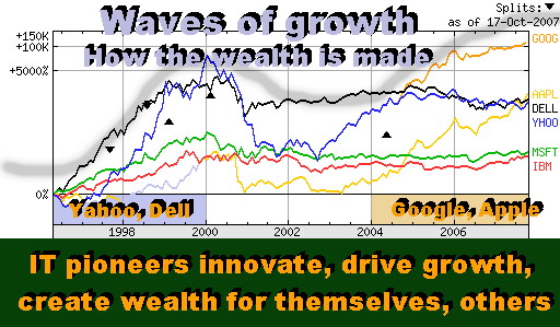 Updated 10/19/07, 7:10AM PDT; adds Market Update: Google shares soar...How Wealth Is Made in IT Industry: Waves of Growth Rise on Founder Genius, Subside on Professional Management's MediocrityGoogling to Top of IT World Creativity Drives Growth, Creates Wealth for Innovators, Their Backers; It All Starts in Garages, Not Fancy LabsSCOTTSDALE, Oct 18 - "There is nothing new