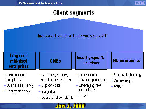 IBM said its fourth quarter earnings from continuing operations rose 24% on a 10 increase in revenue. IBM said 6 percentage points of its revenue increase was due to the weaker dollar, suggesting other U.S. firms with overseas customers could enjoy a similar currency benefit. The early risers among the stock traders applauded the news by bidding up Big Blue shares, buoyed by its earnings report amid the general market uncertainty, especially in the financial sector. Unwarranted Pessimism: IBM Stock Is Still Worth $125 or More We have been saying all along that Wall Street was perhaps unduly tarring IBM with the financial sector's malaise brush after the third quarter slowdown in IBM's mainframe business. Subsequent stellar results by HP and Accenture, for example, hinted that investors may have read too much into it, and were unduly pessimistic about the IT sector and Big Blue in particular. Today's IBM announcement proved that in spades. For, it is now evident that IBM is putting its money where its mouth was - by growing aggressively in the SMB and the emerging markets that are the growth engine of both the U.S. and global economies. And that trend is only likely to accelerate through 2008 and beyond as the organizational changes that IBM just announced take hold (see below). We have been saying since Nov 2006 that IBM stock is worth around $125 or more (see IBM: A $125-Stock... ). We still think so. The only thing that has been changing was investor perceptions, first down (since Oct 2007), and now back up. Wall Street had also seemed to agree with our $125 assessment prior to IBM's 3Q07 release (see "On the Button Again, Oct 2007), as it drove the stock up to the $121-range. But then it backed off, fearing IBM may be swept up in the U.S. banking industry crisis. Now that they can see such fears were unwarranted, investors are jumping back into the Big Blue bandwagon. IBM plans to provide detailed fourth quarter earnings results on Thursday (Jan 17). Meanwhile, Big Blue's preliminary results have already given the Dow Jones a lift this morning. The most popular Wall Street index has been up by over 100 points since the opening, mostly on account of the positive IBM news. Back to the Future: New IBM Reorg Focuses on Customers, SMB Meanwhile, IBM's latest organizational changes that the company announced internally in the last two weeks promise to strengthen its business even more in 2008 and beyond. That's because they put the customer front and center, especially the SMB (small and medium size business) customer, the fastest growing segment of the U.S. and world economies. The head of IBM hardware Bill Zeitler said in a Jan 3 letter to the Systems Technology Group (STG) employees that the purpose of the new organizational structure is "to move to a client-centered structure -- top to bottom."