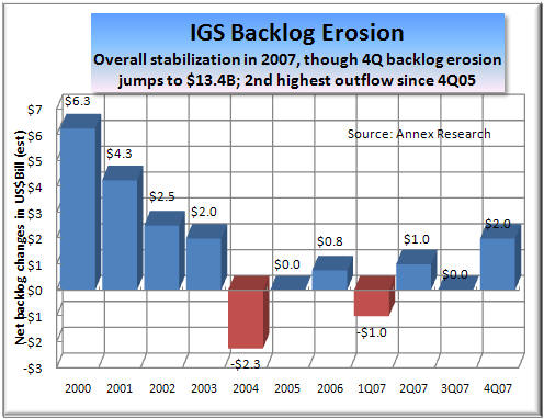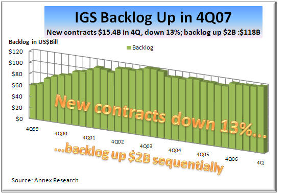 But the $2B jump in IBM backlog since 3Q despite a 13% decline in new signings suggests that IBM services has been playing tougher defense in the services area. Still the outflow of business ("rescoping"/cancellations/expirations) from the backlog in the fourth quarter amounted to $13.4 billion, the second highest figure since the fourth quarter of 2005.