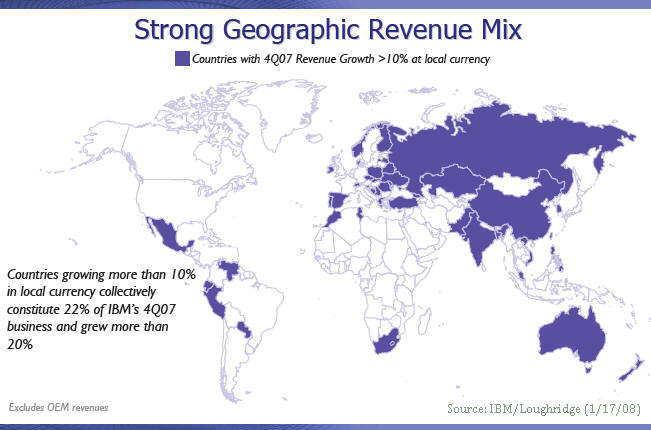 Updated 1/18/08, 8:30AM, adds Market Update...Analysis of IBM's 4Q07 Business Results Services, Emerging Markets Boost IBM Improved Profitability across Business Segments Also Strengthens Big Blue's Bottom Line; CFO Bullish on 2008 SCOTTSDALE, Jan 17 – Have you ever read a book by checking out the last chapter first? Well, that's what IBM did with its double-dipping fourth quarter release. As you saw three days ago, IBM first released its preliminary top and bottom line results. Wall Street loved it (see "Big Blue Shines in Fourth Quarter," Jan 14). And this afternoon, after the markets closed, the company filled out the mid-sections of its financial statements. Wall Street loved it even more. Big Blue shares were up 4.85 points in after-hours trading to $106, and are still rising as we write this.