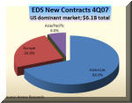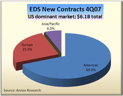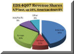 prior-year U.S. Government: Fourth quarter revenue was $624 million, flat compared to the prior-year period. Operating profit was $92 million, down 34%, due primarily to contractual price reductions. Europe: Fourth quarter revenue was $1.8 billion, up 3% from a year ago. Operating profit was $352 million, up 15% from 4Q06. Asia/Pacific: Fourth quarter revenue was $478 million, up 16 percent compared to the prior-year period. Operating profit was $71 million, up 41 percent from $50 million in the prior-year period, driven primarily by MphasiS and improved contract performance in the region. Outlook For 2008, EDS expects revenue of more than $22.5 billion and adjusted earnings per share of about $1.35, and hopes to sign new contracts worth more than $20 billion. The company also expects free cash flow of about $900 million. So 2007 was by no means a barn-burning year for EDS. But it was a year of solid sales growth and of repositioning of the company's strategies to take advantage of the higher margin deals in the marketplace (see "Moving Up the Stack," Feb 2007). As a result, we think that Wall Street's pessimism about the EDS future under Ron Rittenmeyer is exaggerated, just like its ebullience may have been overstated in the early years of the Michael Jordan era.