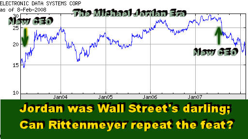 During his four years-plus as CEO, Jordan had become Wall Street's darling by cutting costs and transferring contract fulfillment jobs to India. Except in his last full year as CEO (2006), however, Jordan has done little to inspire investors' confidence in the company's ability to grow sales and develop new markets. Ironically, that's exactly what the new CEO, Ron Rittenmeyer, has been trying to do during the time the stock has been slumping. Strong New Bookings For example, EDS