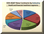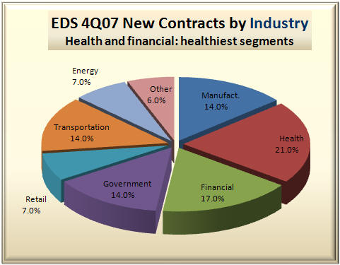 Fickle Wall Street But Wall Street seemed preoccupied with its own minutia... which in EDS's case meant coming short of its 57 cents per share earnings analysts had been expecting on overall revenue of $5.88 billion. And so, the stock continued its southward slide. Losses related to restructuring charges may have contributed to it. EDS said an early retirement offer for U.S. employees accounted for a decline in its fourth-quarter earnings. EDS executives said in post-earnings conference call there's no sign that a cooling economy is hurting the company. The fourth quarter 2007 early retirement offer cost the company $154 million, or $0.18 per share. The company also had net after-tax losses associated with discontinued operations of $13 million, and pre-tax items as follows: a write-off of acquired in-process research and development of $6 million, and a reversal of previously recognized restructuring expenses of $4 million. But EDS sounded optimistic about the general business climate in which it was operating. "The economic slowdown that everybody is concerned about, we do believe it is important, and it is something we are watching, but we also feel we are in a pretty good position," Ron Rittenmeyer, EDS chairman, president and chief executive, said in a conference call. For the full year, EDS revenues rose to $22.1 billion from $21.3 billion in 2006. Profit jumped to $716 million, or $1.40 per share, from $470 million, or 91 cents per share. Business Segment Analysis