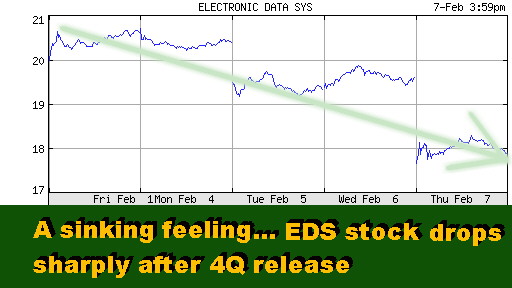 Updated 2/08/08, 2:30PMAnalysis of EDS's Fourth Quarter Business Results Profit Drops, Stock Follows Yet Strong Fourth Quarter Sales Signal Better Times Ahead SCOTTSDALE, Feb 8 – Electronic Data Systems Corp. (EDS) shares fell almost 9% Thursday after the computer services and consulting giant reported a 13% drop in its fourth-quarter earnings, and offered lower-than-expected forecasts for its first quarter and full-year 2008 outlook. EDS said fourth quarter revenues rose 2% to $5.83 billion from $5.7 billion in the same quarter a year ago. But net income fell to $189 million, or 36 cents per share, from $217 million, or 40 cents per share, in 2006. As a result, EDS shares sank Thursday for a third day in a row, closing