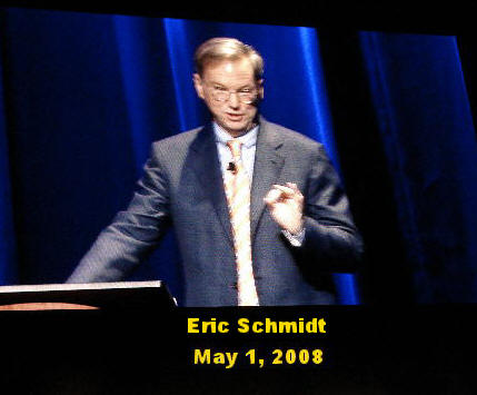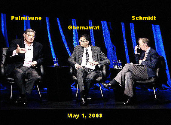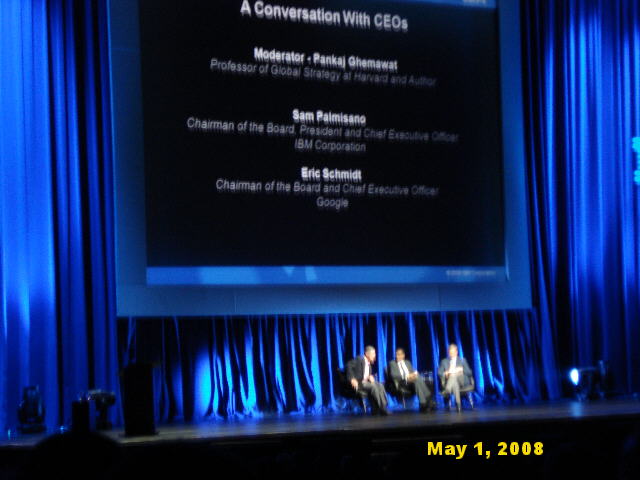 They upload about 70 million photos to Go These are numbers of monstrous proportions that would have choked up any traditional approaches to handling of such masses of data. Enter IBM's "cloud computing" concept, When the technology was first announced a year ago, some in the industry referred to it as Big Blue's "secret sauce." Well, the secret is out. In October of last year, IBM and Google decided to release the cloud technology to universities around the world. The response by innovative students around the world was phenomenal. One 19-year old, for example, wrote a model that simulates the Big Bang theory (expansion of the universe, supposedly some 14 billion years ago). The cloud computing technology spawned such a flood of new ideas that Google and IBM could not keep up even with the refereeing role, trying to decide what concepts would fly and what ideas did not have much of a chance of success. So they turned that function over to the National Science Council, Schmidt said. "This (cloud) platform will literally change the world," the Google CEO summed it up. "IBM has a culture of innovation that is quite compatible with Google's," he added. Just to show you how much collegiality there seems to be between Palmisano and Schmidt, when the two spoke again in a panel discussion later on, the IBM chairman credited Google with the idea to release the Cloud technology to the universities, while Schmidt thought the Academic Initiative programs came from IBM. "Eric is very modest," Palmisano replied. It was interesting to hear Schmidt described the "chaotic" style of Google meetings. "Nobody looks at each other," He says. "We all look at computer screens and discuss the ideas that are being presented and tested dynamically, as we speak." (also see "Googling to Top of IT World," Oct 2007). To which Palmisano replied. "Oh, our developers do look at each other and yell face-to-face," as he described the passionate debates that take place in IBM's research labs. Convergence of Enterprise and Consumer Markets? Former Harvard professor, Pankaj Ghemawat, who moderated a discussion between the IBM and Google CEOs that followed their opening remarks, asked if they saw a convergence between the enterprise and consumer markets in the future. The IBM CEO pointed out that the new Blue Business