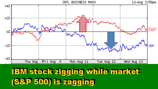 So even though IBM shares have outperformed the market by a wide margin in the last 12 months (see above chart), they are lagging behind this week, for some strange reason. Summary In short, the company's fundamentals used to be a determining factor in its stock performance. That's clearly not the case anymore. Whims and frills of Wall Street portfolio managers now seem to outweigh the corporate top and bottom lines. What happened to the IBM stock this week demonstrates that in spades. On two successive "no news" days during which the overall market soared, Big Blue shares lost nearly $7 billion of their market cap. When the company released its second quarter results last month, IBM pulled the market up by its boot straps (see "IBM Pulls Market Up by Its Boot Straps ," July 17). For a while, the two moved in tandem. This week, somebody on the Street decided to send Big Blue into a dive, leaving the rest of us mystified as to why. Welcome to the Wall Street Casino! It is no place for the rational or the faint-hearted. Happy bargain hunting! Bob Djurdjevic
