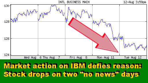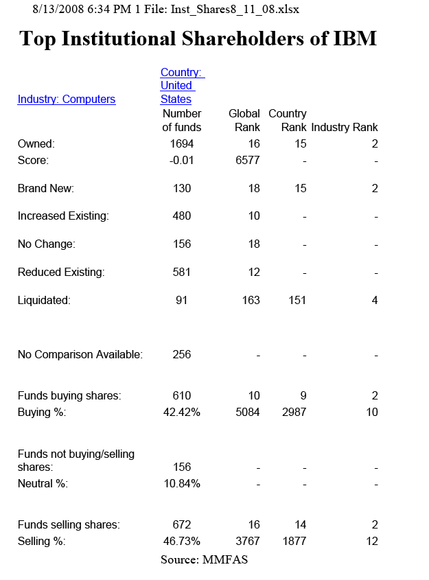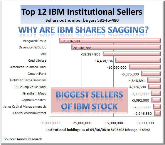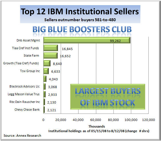 Updated 8/03/08, 7:30PM PDTAnalysis of IBM Institutional Shareholdings Big Blue Stock Sags on "No News" Days Institutional Dumping of Shares - One Possible Reason SCOTTSDALE, Aug 13 – When a company does well in business, its shares will also rise. That's an age old truism, right? Well, we all know by now that the old truism as become an anachronism. Modern stock market is driven by investment cash flows' ebbs and rises, not the corporate bottom lines. So keeping that in mind, how to you explain what happened to the IBM stock earlier this week? Take a look at the charts... On two "no news" days (as far as Big Blue was