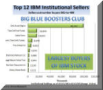 Why were IBM shares sagging while the market was soaring? Once again, we have to go look at investment cash flows to try to answer those questions. The biggest waves are made by the largest shareholders - the Wall Street institutions. They sometimes trade a few million shares here, a few million there... at the flick of a finger. And while the actual trades from this week won't be known for some months, we have a sense that some major institutions must have been dumping a lot of IBM shares for reasons that you and I can only speculate about. What we do know from the past reports is that there has been a lot of churning among the IBM shareholders. Most of this data goes back to late May, but some of the reports are as current as last week. The left chart above shows the top 12 largest institutional net sellers of IBM shares as of their last reports to the SEC. Ditto re. the top 10 biggest net buyers of IBM stock whom we dubbed the Big Blue Boosters Club (above middle). And if you click on that table (above right), you can see that the net sellers outnumbered the net buyers of the IBM stock by 581 to 480, according to the latest report by MMFAIS (Mutual Fund Facts About Individual Stocks).