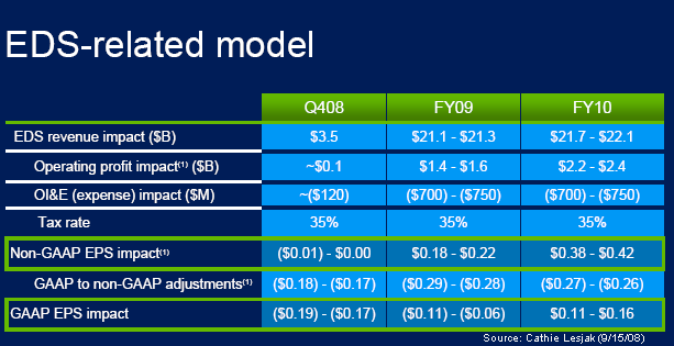 Notwithstanding such questions, the big picture of the EDS acquisition is a net positive for HP. In terms of financial metrics, EDS will contribute about $3.5 billion to HP's top line in the current (fourth) quarter, and about $21 billion in the next fiscal year. At the bottom line, the EDS merger and the related charges will have a negative impact in the first year, before turning to black in fiscal year 2010, according to Lesjak (see above chart). That's because the company expects to save about $1.8 billion per year as result of the cost cuts.