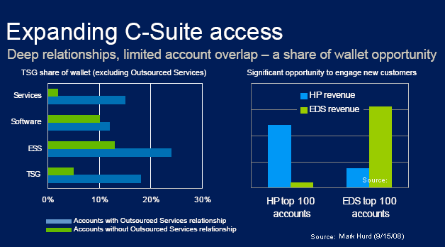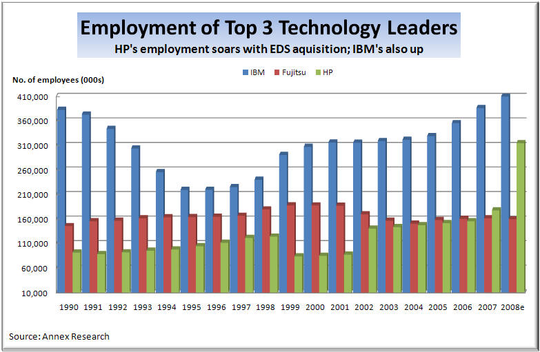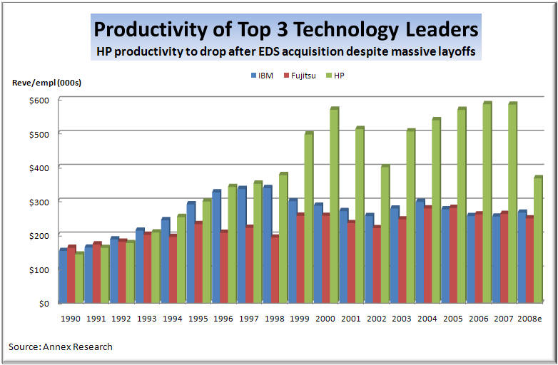Mark Hurd even highlighted that point in today's meeting with analysts (see "limited account overlap" in the above chart). So we have a sense that that’s what made the acquisition attractive to the current HP CEO, too, besides the price, of course. He saw the mutual benefits from a deal Fiorina was too scared to even look at. Ann Livermore, the head of the company's Technology Solutions Groups that includes services, wrote to this writer after the analyst conference saying, "we are very excited about HP's capabilities with EDS now part of the portfolio. Our clients are very positive." Furthermore, the EDS deal gave Hurd a chance to carry out massive layoffs. Michael Jordan, the former EDS CO, has also been slashing jobs at EDS for years. But we were critical of him at the time because EDS was already the LEANEST of all top global IT services competitors (see "EDS to Cut Up to 20,000 More Jobs," Sep 2004, and "Pain without Gain", Oct 2003). We felt what EDS needed back then is SALES growth, not cost cutbacks. It still does.