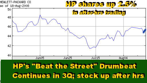 Updated 9/15/08, 6:00PM PDT, adds Massive HP Layoffs...Analysis of HP's Third Quarter Business Results "Beat the Street" Drumbeat Continues Stock Up After-Hours as Company Again Blows Wall Street's Revenue, Profit Estimates Out of Water SCOTTSDALE, Aug 19 – At HP, “beat the Street” continues to be the drumbeat to which the company dances every quarter. Once again, HP has exceeded Wall Street estimates for both profits and revenues. It has done so consistently ever since Mark Hurd took over as CEO over three years ago. Third quarter revenues were up 10% to $28 billion (vs. $27.4 billion analyst average estimate), while net earnings were $0.86 per share (vs. $0.83 Wall Street expectations).
