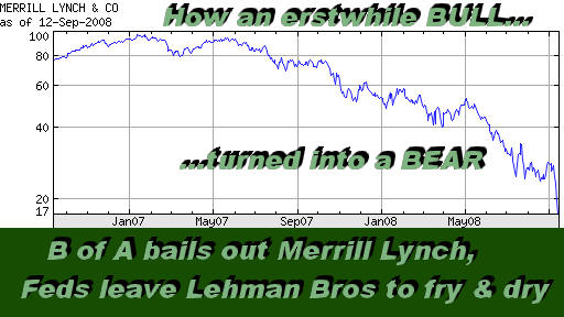 State and federal government officials are also scurrying around trying to figure out how to save another financial whale, the insurance giant AIG. Why Bear Sterns, Merrill Lynch and AIG, but not Lehman Bros and scores of other smaller financial institutions that are failing? Good question. No logical answers from government officials. Guess when a big whale gets beached and the carcass starts to rot, the stench can be smelled for miles around. Same on Wall Street. Washington doesn't want big carcasses piling up on the lower Manhattan beaches ("What beaches?", I suspect you may be asking. Well, there used to be some before big banks paved them over with fools' gold). As a result, a state of panic on Wall Street has caused the Dow Industrial to plunge over 500 points as we speak. Which makes it about a 3,000-point stock market decline since early May.