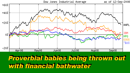 The whole thing is nonsensical, at least in the IT sector. Even as IBM and HP keep on reporting stellar results (see IBM Delivers Explosive Quarter , July 2008, and "Beat the Street" Drumbeat Continues, Aug 2008), the jaded stock market traders keep selling off their shares along with those of the failing financial stocks. Ditto re. consumer-based Google and Apple stocks which have even less to do with the failures of the financial giants. So proverbial IT babies are being thrown out with the bathwater. Again, nothing new under the Wall Street sun. So rather than repeat the comments we have already made six months ago about this financial crises, we'll incorporate them here by reference (see below). Happy bargain hunting! Bob Djurdjevic