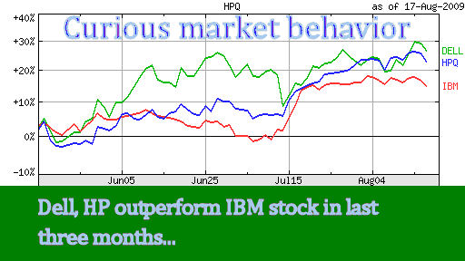Updated 8/19/09, 10:30AM HIT; adds Executive Quotes, MARKET UPDATEAnalysis of Hewlett-Packard's Third Fiscal Quarter ResultsLess Than Meets the Eye...Steep Revenue Contraction for Third Quarter in a Row; HPS - New Moniker for Hocus-Pocus Services?HAIKU, Maui, Aug 18 – The world's largest computer company is getting smaller quarter by quarter. HP’s third quarter results, released after the markets closed this afternoon, show a continued contraction that began in the first quarter of its current fiscal year. Worse for HP shareholders, the latest figures are less than meets the eye. Most of HP's major business lines suffered a double digit revenue declines. The only segment that appeared to grow – services, up 93% as reported - rose mostly on the basis of the EDS acquisition a year ago. Since the company has been refusing to provide detailed EDS-HPS breakdowns which would help reconcile the HPS results to the year-ago quarter, we have to wonder if HPS may not have acquired a new moniker - Hocus-Pocus Services? (for more details, see below). Yet even such an apples-and-oranges comparisons weren't enough to offset the company's overall revenue decline of 2% in the quarter to $27.5 billion. As for the bottom line, HP net earnings dropped even more – down 19% since a year ago. They were even down 4% sequentially from the company’s disappointing second quarter results (see Suddenly, All Lines Point South, May 2009). Yet the stock market has boosted the HP stock in the last three months even more than IBM’s, a company that reported far superior results in its latest quarter (see Big Blue Blows Lid Off Forecasts). Interestingly, Dell has topped them both (see above). That’s how perverse the current market has become. Or was it that the market current bullish euphoria is setting aside the negative facts in preference of executive sweet-talk? "I'm confident HP will emerge from the current market environment as a stronger force in the industry," Mark Hurd, HP CEO, told the analysts in a post-earning teleconference. "As this quarter demonstrates we are executing in the marketplace, executing on the EDS integration, and executing on our cost initiatives." Execution, execution... same ghoulish-sounding theme as when the last quarter's results hit the Street. But the HP shares dropped by about 2% in after-hours trading following the release of its third-quarter results. That's about by how much they had risen earlier in the day in anticipation of the news. So "buy on rumors, sell on facts" also appears to be the way the market is greeting financial news these days. The HP