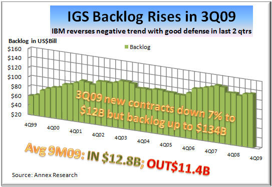 Someone Wall Street t So those who blamed the contract signings for IBM's alleged "woes" only managed to show their ignorance of how a services business works. Furthermore, the CFO Mark Loughridge said during the post-release teleconference with analysts that IBM signed three deals in the first two days of October with a total value of nearly $1 billion. "These three deals would have pushed our outsourcing growth rate to 16% at constant currency, which is consistent with the first half performance of 18% growth," he said. He added that, "with a solid start to the quarter and looking at the pipeline of deals we have, we should be able to grow outsourcing signings double-digits in the fourth quarter." Even without those mega deals, IBM's outsourcing signings grew 1% in the third quarter. So if IBM services had a weakness, it was in the consulting and systems integration business.