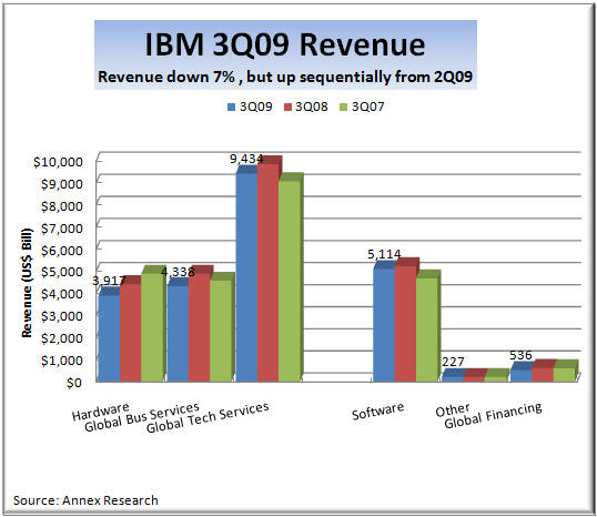 So there you have it... our précis of Big Blue's latest results, based on FACTS. You can contrast that with the way Wall Street reacted to them. And now some more details... Business Segment Analysis IBM third quarter revenues