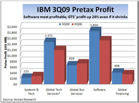 for curr IBM said it gained market share in WebSphere, Information Management, Tivoli and Rational software during the third quarter. But the most distinguishing feature of IBM's software is its high profitability. At 86% gross margin, it is by far the company's most profitable segment. And as you could see from the pretax profit chart above, the software contributes more dollars to Big Blue's bottom line than any other business segment, including the bigger services operations.