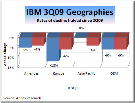 12% (11% in constant currency). But that rate of decline repre Revenues from System z mainframe server products decreased 26%. System p dropped 10%, System x rose 1%, while storage dropped 13%. Revenues from Microelectronics OEM decreased 1%. IBM said it gained market share in System p, System x and disk and tape storage during the third quarter despite shrinking revenues. Meaning, it was winning business from its direct competitors whose revenues declined even more. Summary It is impossible to interpret emotional decisions using rational arguments. There is no way, therefore, to explain Wall Street's negative reaction to IBM's solid third quarter results. So the only thing left to say by way of a summary is that IBM shares are today even more undervalued than they were over a week ago when we restated our assessment that they were undervalued (see A Rally of Hope over Fact, Oct 5). Which would make them an even better buying opportunity for the investors who are willing to bet that the current rally of hope over fact will continue. In other words, having depending on reason and logic seems detrimental in this type of a market. What happened to the IBM stock in the last 24 hours underlines that in spades.