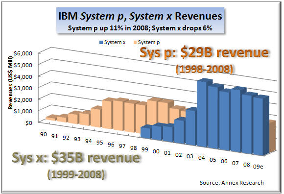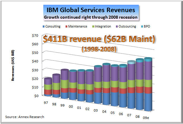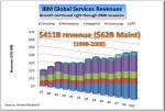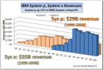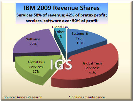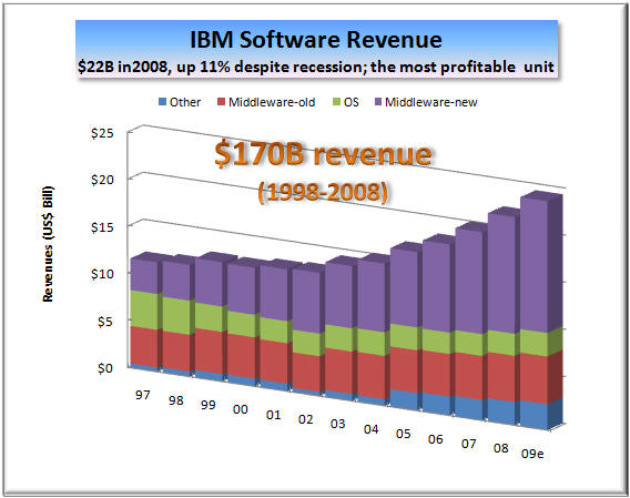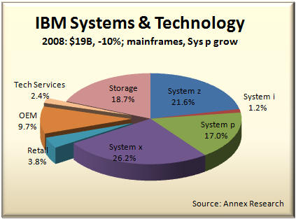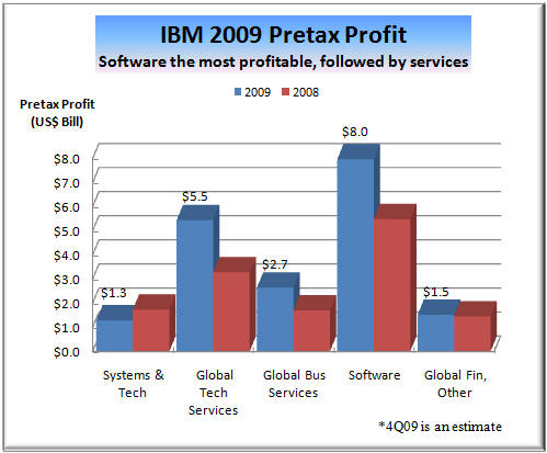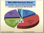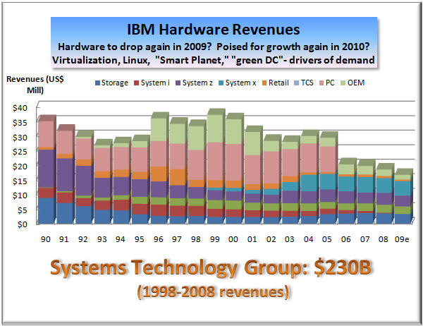As a result, Armitage also said that Systems Software "a key STG growth engine," as well as "the integrating force in the data center." Creation of this new software unit with IBM's hardware division is an excellent example of how product lines are blurring; how integrated Big Blue itself is becoming. The same is true of integration between STG and IBM's Services and Software units. All three are now trying to work together on creating "smarter solutions" for IBM customers, as befits someone who uses a holistic approach to diagnosing and treating "patients" (customers) and live on a "smarter planet." It is exactly such diversity in horizontal businesses and collaboration between them that has given the impression that IBM is "recession proof." While IBM hardware business has suffered setbacks due to customer spending cutbacks in a recessionary global economy (left chart), you can also see that the two other, bigger components of Big Blue's business - services and software - have continued growing merrily as if there were no recession. Services now represents nearly 60% of IBM's business and 46% of pretax profit. The enormously profitable software brings it about as much in pretax income (45%) from only 22% of total revenue. The two account for over 90% of IBM earnings. But IBM hardware technology is the backbone that keeps Big Blue together in good times as well as bad, through rain and shine, through thick and thin. Without STG to back them up, neither IBM software nor services would be looking so "smart" these days. Not Everything IBM Touches Turns to GoldOf course, not everything that IBM touches turns to gold. Does anyone still remember TCS or GES, for example? They were among the much touted Big Blue "seedlings" a few years ago that did not bear fruit and grow into mature trees (see Seedlings Sprouting Stronger Limbs - update to "IBM State of the Union" [Annex clients click here], Oct 2007). Similarly, the growth of Retail Solutions business, which offered much promise two years ago, has fizzled in the last 12 months. But to us, the biggest