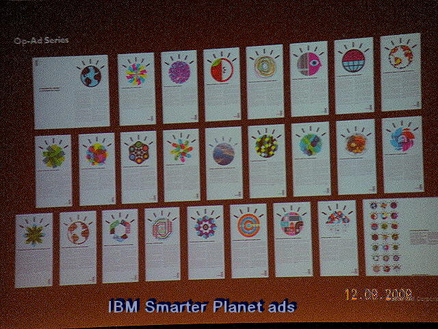 IBM's "smarter planet" idea, you have probably b Jon Iwata, IBM's top communi "We realized that 'smarter planet' was a leadership agenda, not just an IBM self-promotion," Iwata said. "We" was Iwata and Palmisano, the IBM boss. They decided to go through with the campaign despite the blackened economic backdrop in late 2008. And now, "smarter planet" has become a theme song and a rallying point for most of IBM groups. And not just IBM's... IBM started with 20 "showcase solutions" which illustrated unorthodox ways of using technology, mostly by governments across the country and around the world. Why would an establishment company seek unorthodox ways of using technology? Because it is trying to expand its business universe. "Smarter planet opens up 40%
