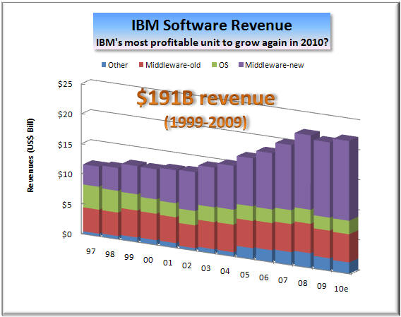 world around it Meanwhile, while we are "Waiting for Godot," this raconteur offers to the loyal and true True Blue shareholders the Raconteurs' song "Steady, as she goes." We have modified the lyrics to fit the IBM situation (click on the above left image to read the lyrics, then again on the YouTube picture within that PDF file if you want to see the Raconteurs' music video). Business Segment Performance In 2009, all major IBM lines of business declined at varying rates. But most of them showed improved profitability. Which is why Big Blue's earnings per share were virtually flat last year, even though the revenues dropped 7%. Another example of quality over quantity. As we look ahead, you can expect all three major IBM lines of business to grow in low single digits.