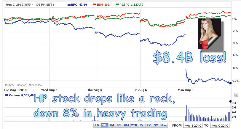 Updated 8/09/10, 2:00PM HIT, adds "Monday, Monday:" HP Stock Drops 8%Hewlett-Packard CEO Mark Hurd Ousted amid Sexual Harassment ChargesDo As I Say, Not As I DoHP's "Humpty-Dumpty" Who Could "Walk on Water" Could Not Walk His TalkHAIKU, Maui, Aug 7 – True leaders lead by example. Up until 4PM Eastern time on "Hiroshima Day" (Friday, Aug 6), anyone in the IT industry and on Wall Street would have counted HP's CEO Mark Hurd among such leaders. And then, suddenly, without notice or warning, after the markets closed on Friday, HP's "Humpty-Dumpty had a great fall." Like Jack, who "broke his crown" and crashed down the hill (in "Jack and Jill"), Hurd's pristine image went up in a puff like a nuclear cloud. A CEO who could "walk on water" as far as Wall Street was concerned, could not walk his talk. And "all the King's horses and all the King's men couldn't put Humpty together again." The celebrated CEO's public image disintegrated faster that Dorian Gray's picture (which took on the look of his sins, while the hero of the famous Oscar Wilde's novel continued to appear young and beautiful).